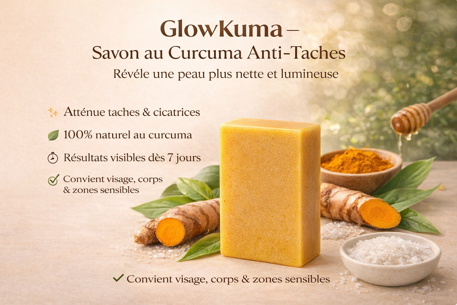 Grâce au savon et aux pads au curcuma GlowKuma, la peau est purifiée et le teint paraît plus uniforme et lumineux. Il aide à révéler une peau plus nette, douce et éclatante