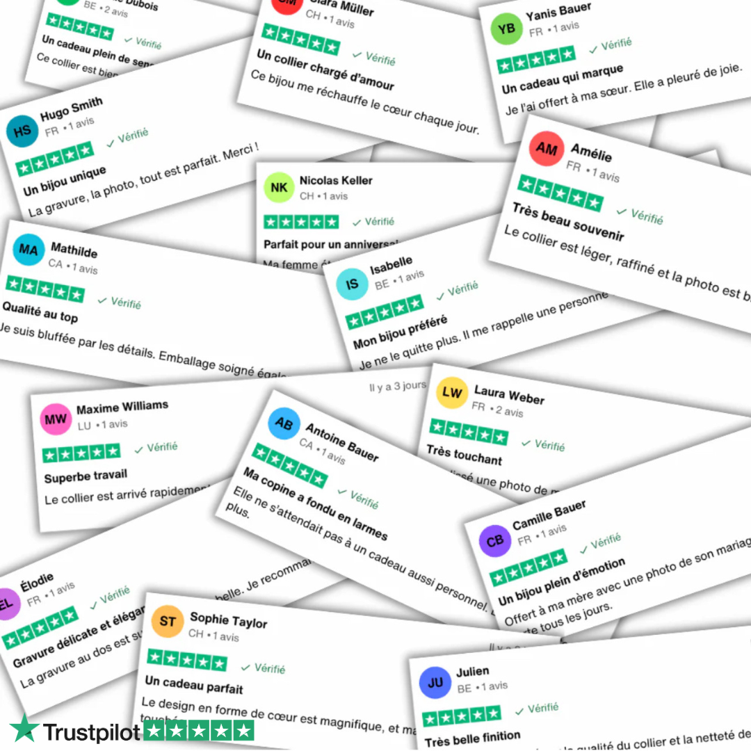 Vos souvenirs méritent le meilleur. C'est pourquoi nous utilisons de l'acier inoxydable 316, de l'or 18 carats et de l'argent sterling 925 pour une durabilité et une brillance maximales. Nos bijoux ne s'oxydent pas et ne rouillent pas, sont hypoallergéniques pour la plupart et ne se ternissent pas et ne deviennent pas verts.